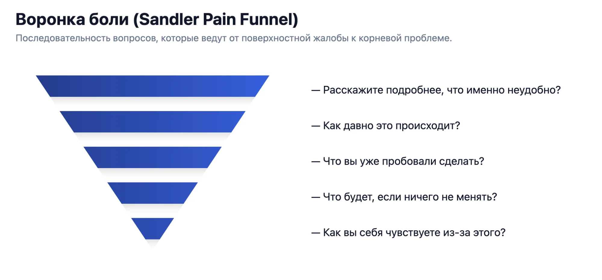Придумайте вопросы. Для этого можно опираться на «воронку боли» все того же Дэвида Сэндлера. Это серия вопросов, которые помогут постепенно докопаться до сути проблемы.