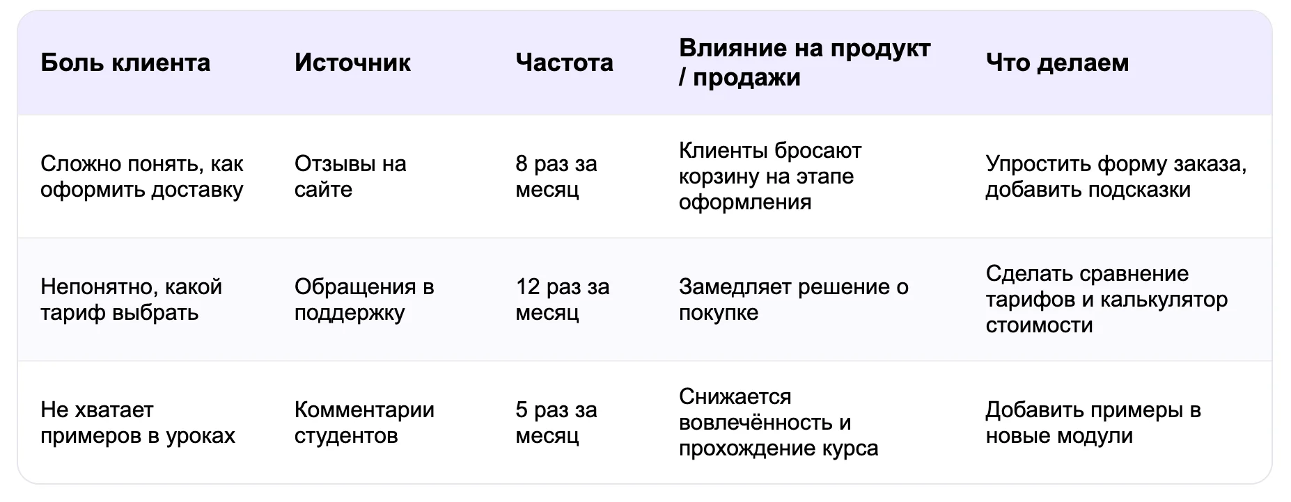 Допустим, мы опросили клиентов и собрали их боли в таблицу. Не стоит сразу же пытаться исправлять или добавлять вообще все, что «болит» у клиентов.