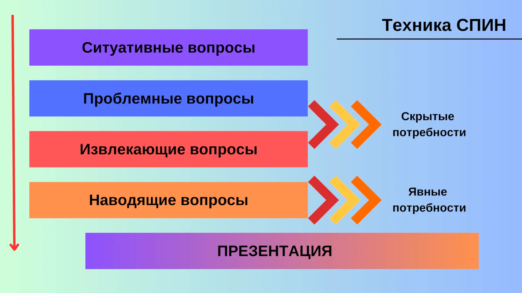 Техника СПИН основана на психологии людей. Вопросы здесь задают таким образом, чтобы погрузить человека в ситуацию, выделить все сложности, подтолкнуть человека к самостоятельному выбору решения и мотивировать к покупке.