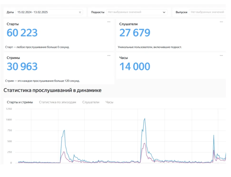Такие платформы как Mave, Подкасты ВКонтакте и Яндекс Музыка предоставляют авторам подкастов аналитику. Она помогает понять, какие выпуски вызывают отклик, а где аудитория теряет интерес. Там можно посмотреть: