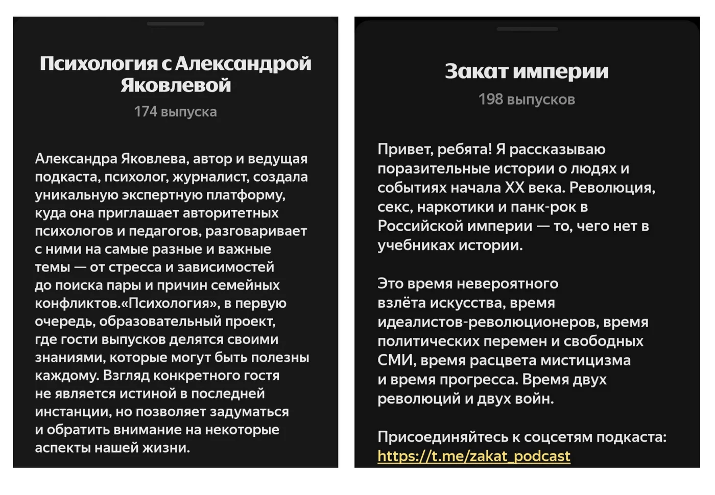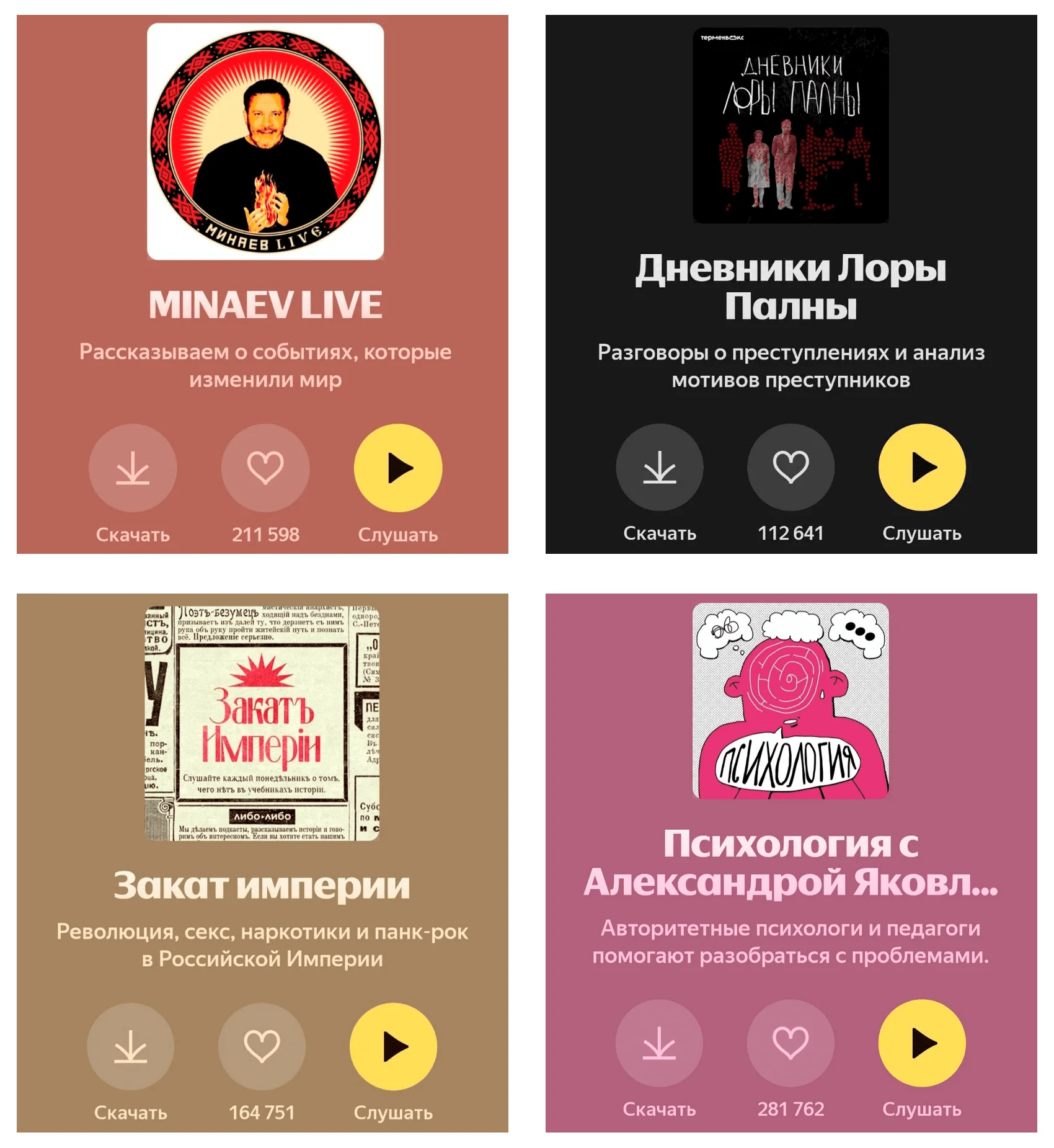 Для усиления эффекта стоит использовать не только анонсы в собственных каналах, но и возможности самой платформы. Например, Яндекс Музыка регулярно формирует подборки подкастов по темам и добавляет новые проекты в плейлисты — это называется фичерингом. Чтобы увеличить шансы попасть в подборку, подкаст должен соответствовать базовым требованиям: