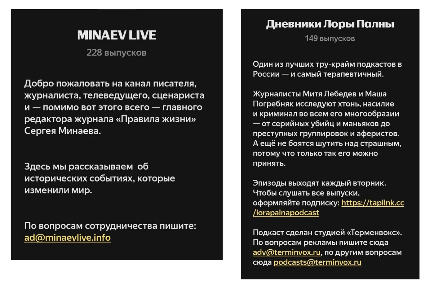 Название должно быть не только цепким, но и отражать суть. Например, «Дневники Лоры Палны» сразу направляют мысль в русло тру-крайма, а «Как я встретил вашу драму» — что речь пойдет о поп-культурном и лайфстайл-контенте. Смешные каламбуры в названии подкаста работают только в случае, если они напрямую связаны с концепцией.