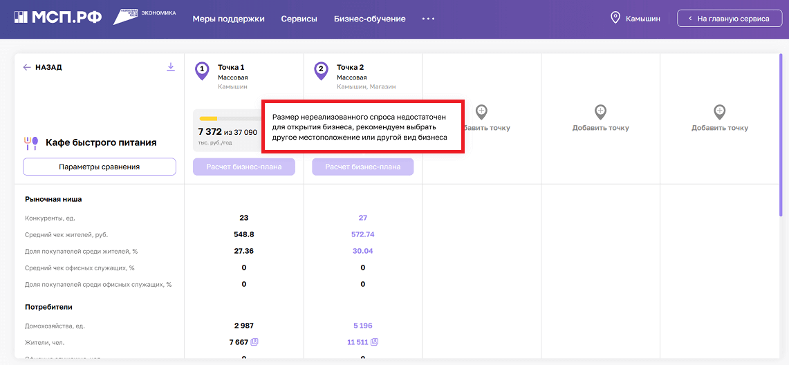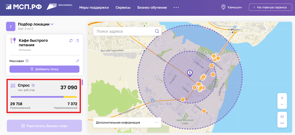 На Цифровой платформе МСП.РФ есть полезный инструмент — «Оценка рынка и расчет бизнес-плана». Можно выбрать интересующее направление бизнеса, поставить одну или несколько точек на карте и получить относительно точные данные по рынку.