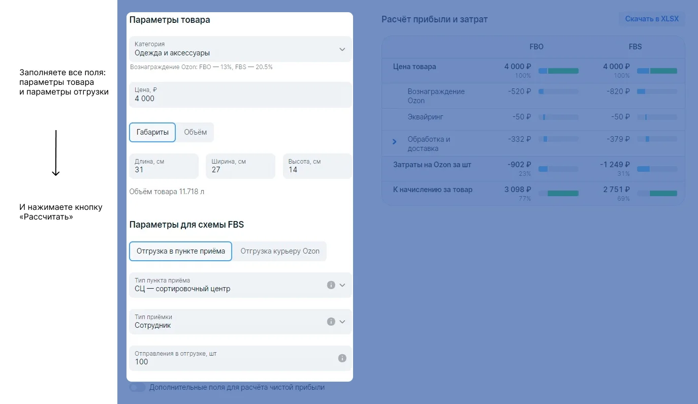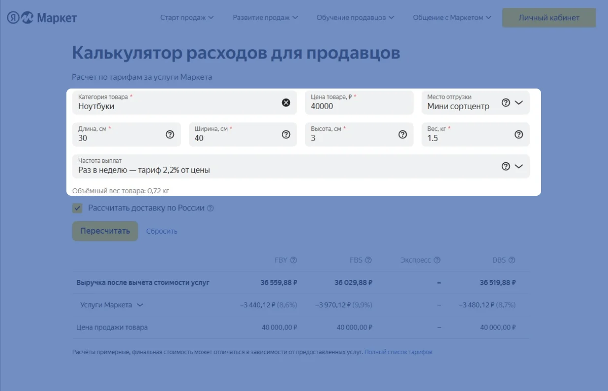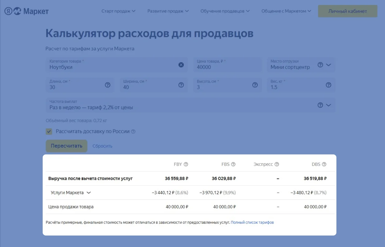 У Яндекс Маркета тоже есть онлайн-калькулятор, в котором можно посчитать примерные расходы для продавцов.