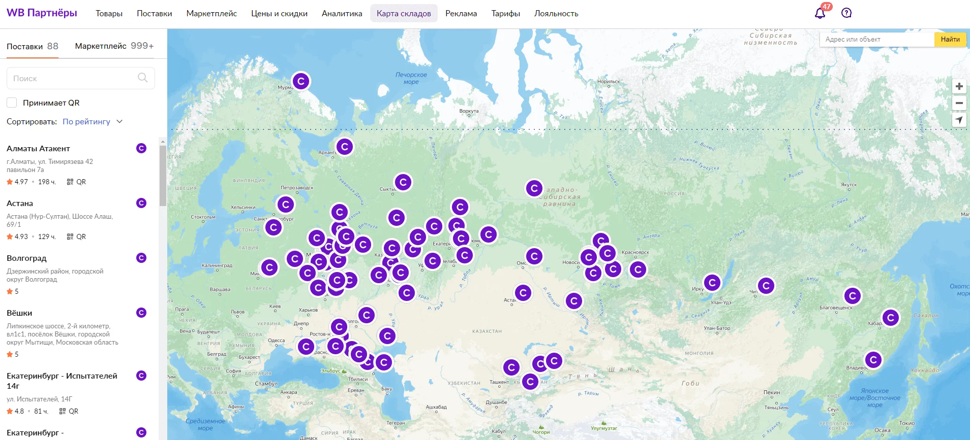 Количество складов. Всего у WB 88 складов, включая Россию, Казахстан, Кыргызстан и Беларусь. А пунктов выдачи больше 30 тысяч.