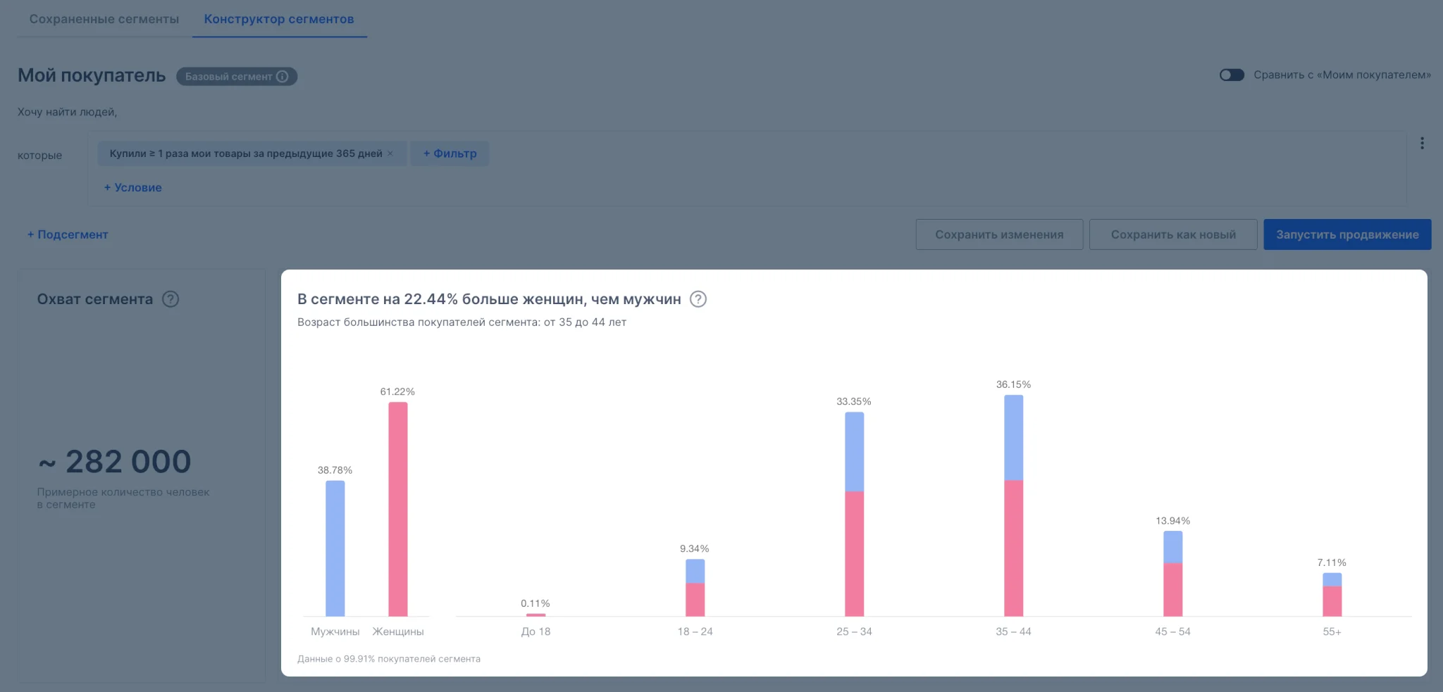 У Ozon есть раздел, который помогает проанализировать портрет покупателя в своем сегменте. Инструмент поможет приблизительно определить, у кого пользуется спросом товар: пол, возраст покупателей, их географию, средний чек. Чтобы использовать инструмент, нужно купить премиум-аккаунт за 5 000 рублей.