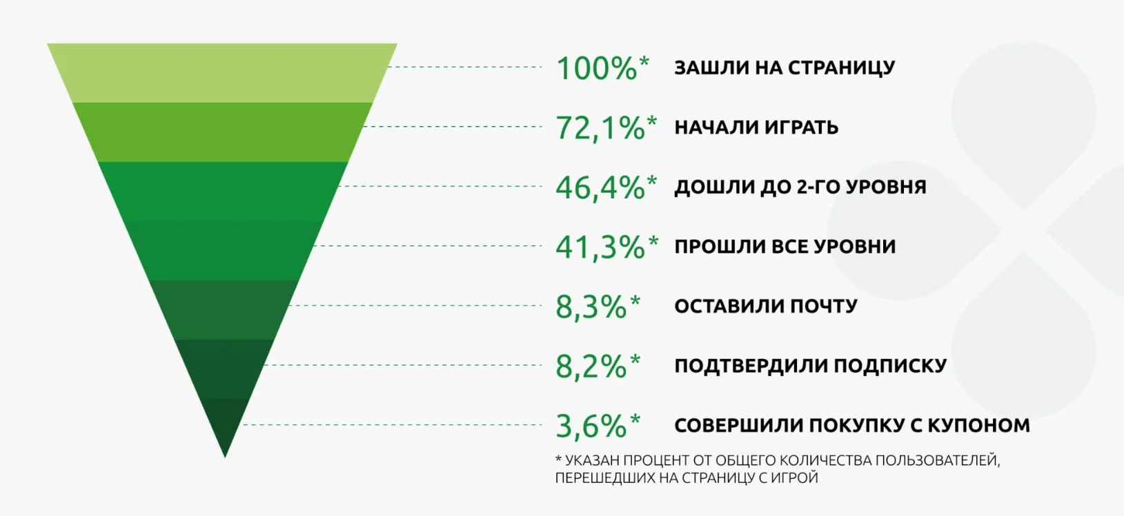 Игра длилась около месяца, за это время страницу с игрой посетило около 50 тысяч человек. 8% от всех пользователей, которые зашли на лендинг, оставили контакты — это больше 3800 участников. Из этих 3800 человек более 1650 человек использовали баллы для покупок в офлайн-магазинах.