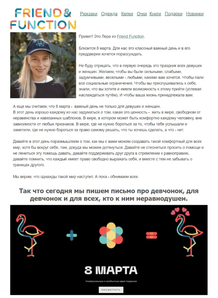 Главное — сегментировать базу подписчиков и не присылать праздничные письма абсолютно всем. Например, не обязательно поздравлять с 8 марта клиентов-мужчин. А если хотите это сделать, то для них стоит сделать отдельные письма — вроде «что подарить девушке» или «идеи для подарков на 8 марта».