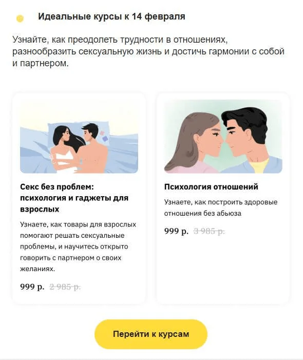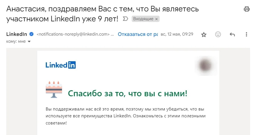 Также персонально можно поздравить с событием, которое связывает потребителя и ваш бренд — круглой даты с момента регистрации на платформе, «юбилейным» количеством заказов или пройденных курсов. Так вы сможете ненавязчиво напомнить о себе и укрепить связь. В то же время, в отличие от поздравлений с днем рождения, можно быть уверенным, что почтовый ящик пользователя в этот день не окажется завален другими аналогичными письмами.