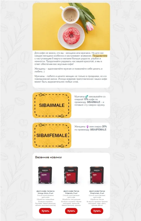 Хороший приём, который можно использовать в поздравительной рассылке и который позволит больше узнать о своей аудитории — наличие двух разных предложений. Например, кофейные обжарщики Sibaristica отправляют письмо в Международный женский день и женщинам, и мужчинам. А вот промокодов в письме дают два — «для неё» и «для него».