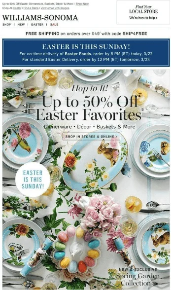 Другой пример — магазин кухонных принадлежностей напоминает, что Пасха в ближайшее воскресенье, и предлагает скидки до 50% на пасхальные товары