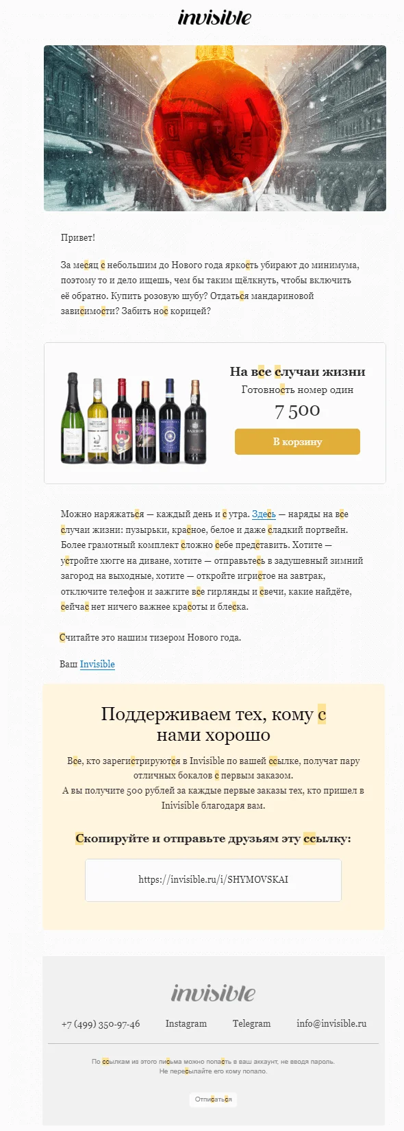 Invisible. Крутая рассылка от магазина алкогольных напитков: письмо написано в том же стиле, что и обычные регулярные. Текста много, но он интересный и поэтому его хочется читать. При этом в письме рекламируют товары, но они органично интегрированы и не перетягивают внимание на себя.