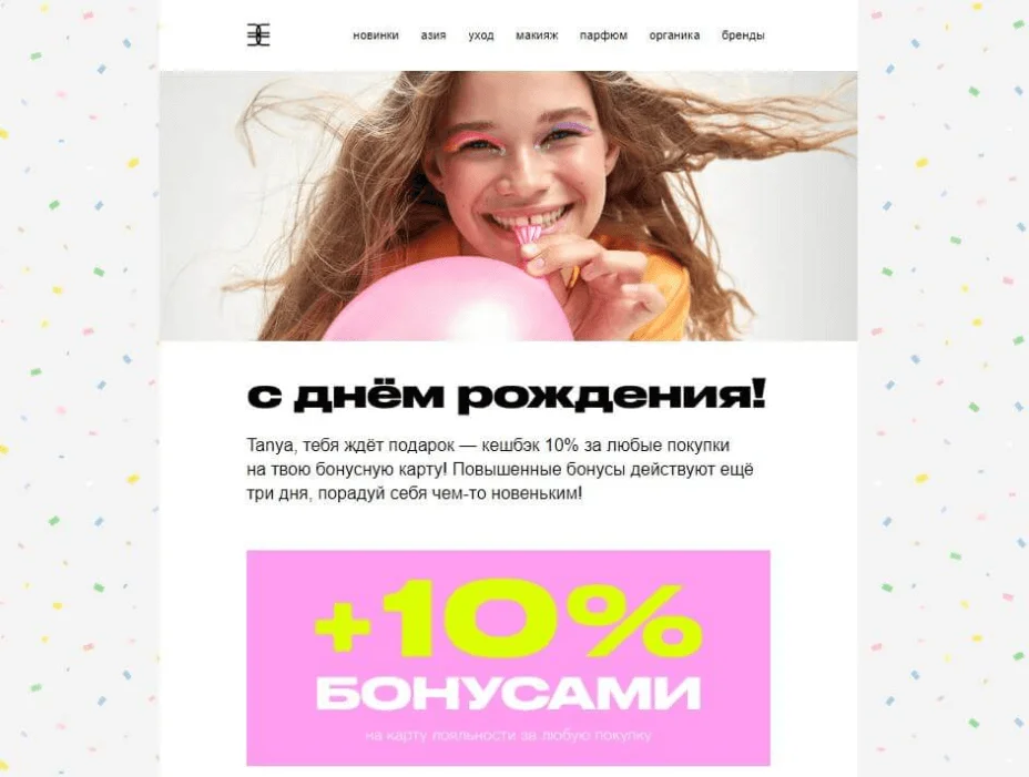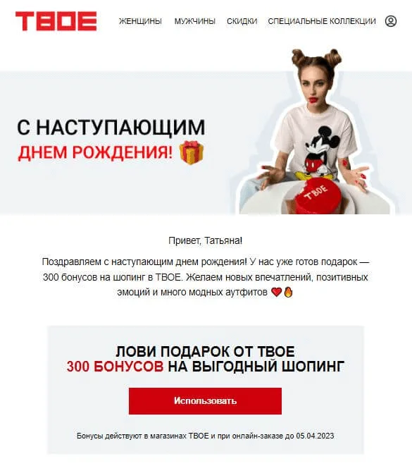 К ним относятся поздравления с днём рождения и прочими событиями, которые важны для конкретного человека. Если они составлены персонально и с душой, то успешно справляются со своей основной задачей: увеличивают эмоциональную связь клиента с брендом.