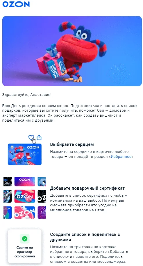 Поэтому лучше отправлять поздравительное письмо заранее: так больше шансов, что его увидят. А ещё у клиента будет время, чтобы выбрать подарок без спешки.
