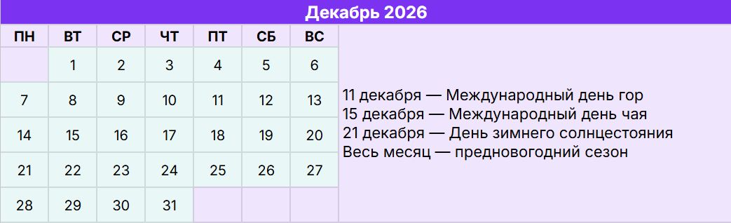 15 декабря — Международный день чая. Время собирать уютные подарочные боксы с пледами и красивой посудой. Хорошо заходит контент, создающий домашнюю атмосферу и согревающий в зимние вечера.