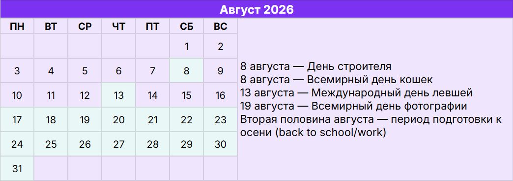 Август — месяц контрастов. Первая половина всё ещё летняя и расслабленная, вторая — уже намекает на возвращение в рабочий ритм. Ключевая задача состоит в том, чтобы не пропустить момент перехода. Со второй половины августа аудитория начинает планировать осень: покупки, обучение, подписки. Это отличное время для мягких анонсов, подготовки к сентябрьским запускам и работы с предзаказами.
