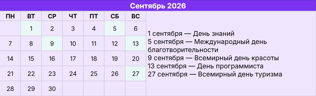 13 сентября — День программиста. В 2026 году праздник приходится на воскресенье, поэтому в B2B-сегменте лучше поздравить партнеров заранее в пятницу 11-го. Хороший момент, чтобы напомнить о себе профильным специалистам через полезные бонусы или тематический юмор.