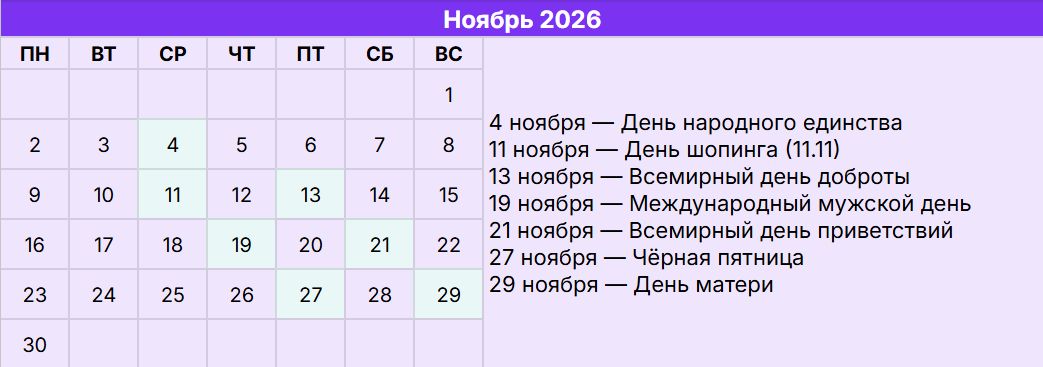 13 ноября — Всемирный день доброты. Повод запустить благотворительные акции или сделать бесплатные услуги для тех, кому это нужно. Хорошо воспринимается контент про социальную ответственность бренда.