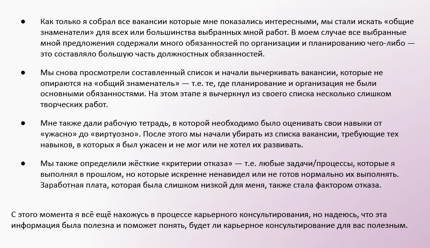 Специализация. Некоторые консультанты специализируются на определённых аспектах карьеры — поиск работы, смена профессии, развитие лидерских качеств и прочее. Выбирайте специалиста, который максимально подходит для решения вашей задачи.