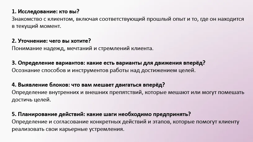 В рамках консультации специалист помогает клиенту определиться с целями, стратегиями достижения успеха и преодоления трудностей. Главная задача — помочь клиенту принять правильные решения в моменте или выстроить чёткий план развития карьеры на будущее.