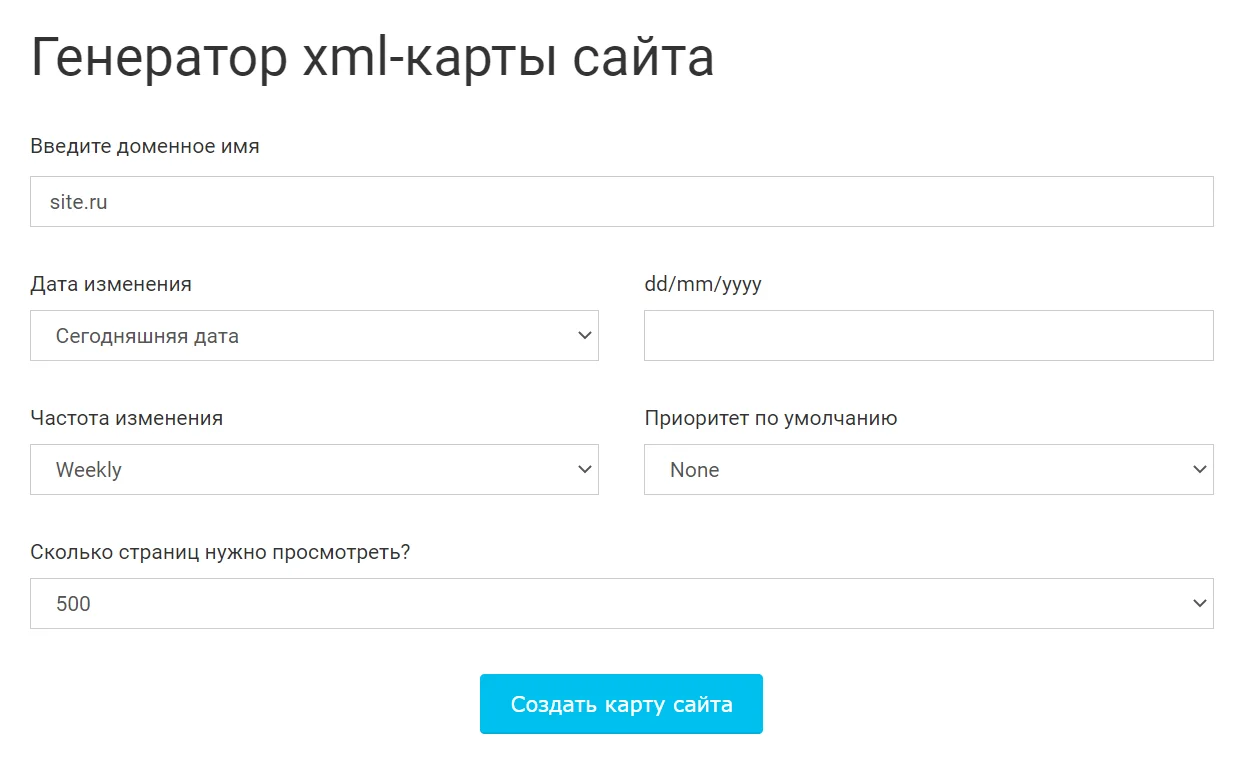 При создании XML-карты сайта в сервисе нужно просто задать необходимые параметры: