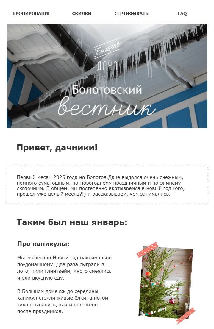 В конце каждого месяца добавили в план «Болотовский вестник» ― новый формат рассылок без промокодов и призывов к бронированию. В этих письмах рассказываем, как прошел наш месяц и показываем атмосферу, чтобы сблизиться с аудиторией, повысить лояльность и вызвать желание приехать. «Вестник» добавляет человечности в коммуникацию с брендом.