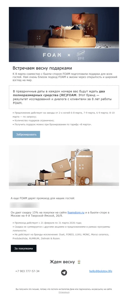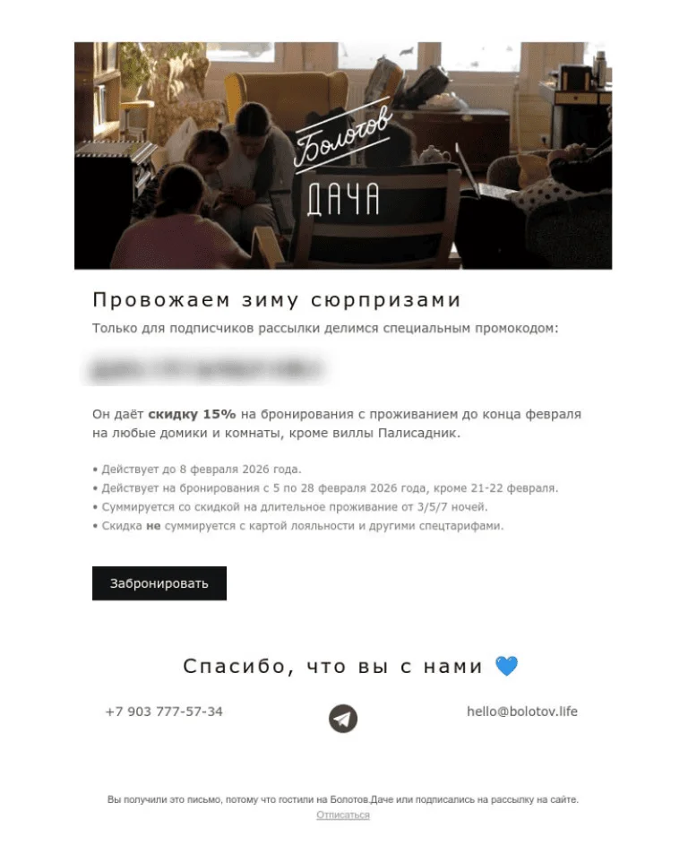 Этот прием создает уникальность предложения и работает лучше, чем когда даем промокоды и в соцсетях, и в рассылке. Подписчикам приятно, что награда только для них ― значит, они не зря нас читают.