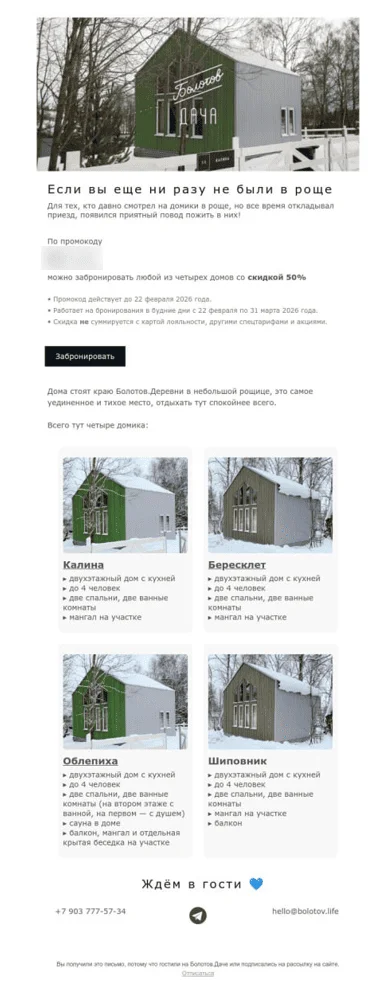 Флеш-акция на любые номера и домики, промокод по которой давали только подписчикам рассылки. За четыре дня собрали 10 бронирований. Это довольно много, учитывая, что скидка быстро сгорала.