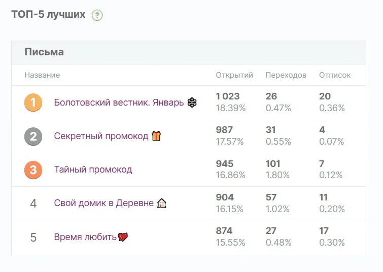 «Болотовский вестник». Мы обнаружили, что «Вестник» за январь оказался самым открываемым письмом за месяц, что удивительно ― там нет выгоды для подписчика. Считаем это успехом в утеплении отношений с аудиторией, потому что они активно читают нас, даже когда знают, что ничего не получат взамен.