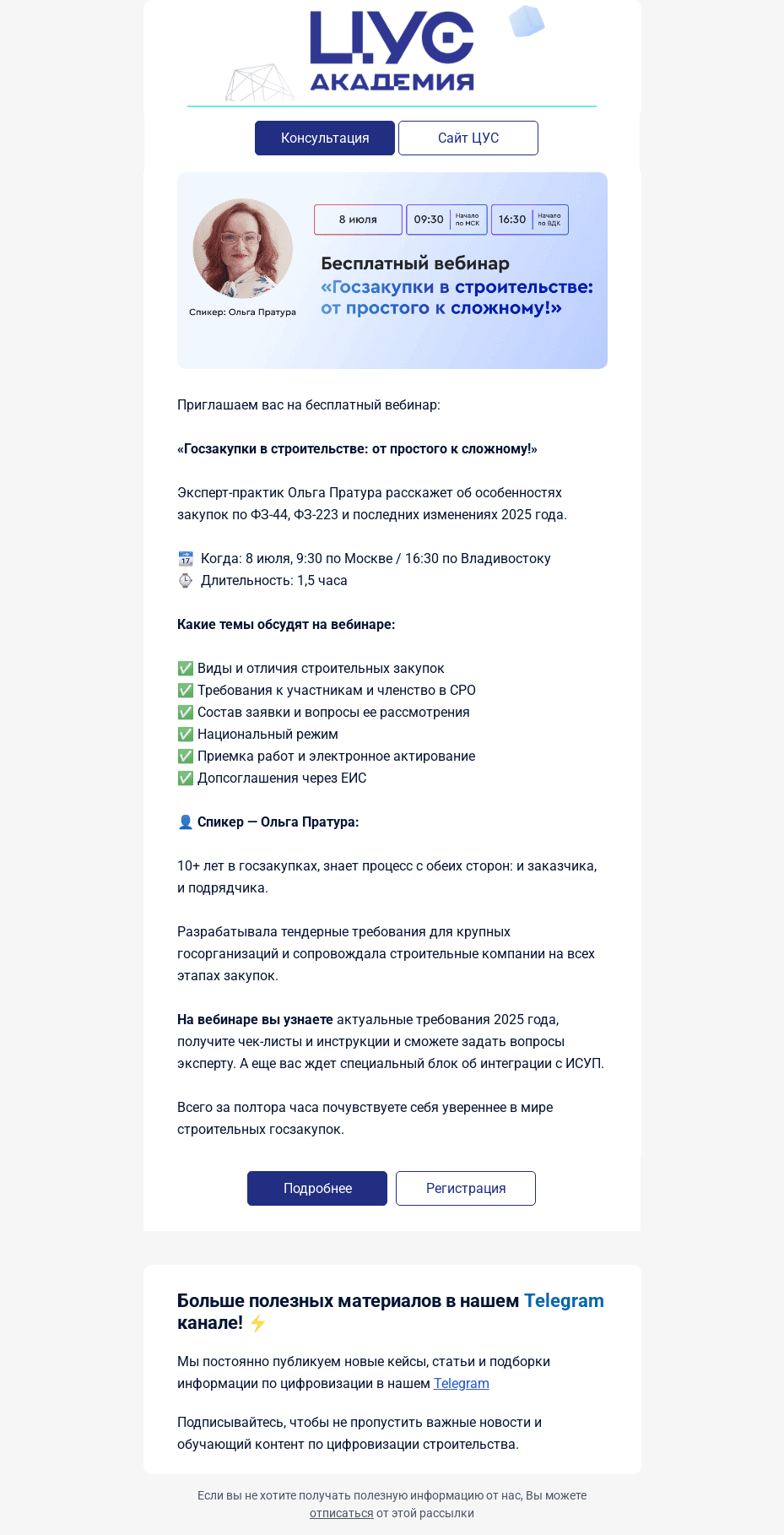 Цель таких писем — привлечь людей на мероприятие. Здесь нет лишней информации, только призыв зарегистрироваться. После регистрации начинается новая воронка, где участники получают более детальную информацию о продукте. Так, после вебинаров отправляем полезные материалы и приглашения на другие мероприятия.