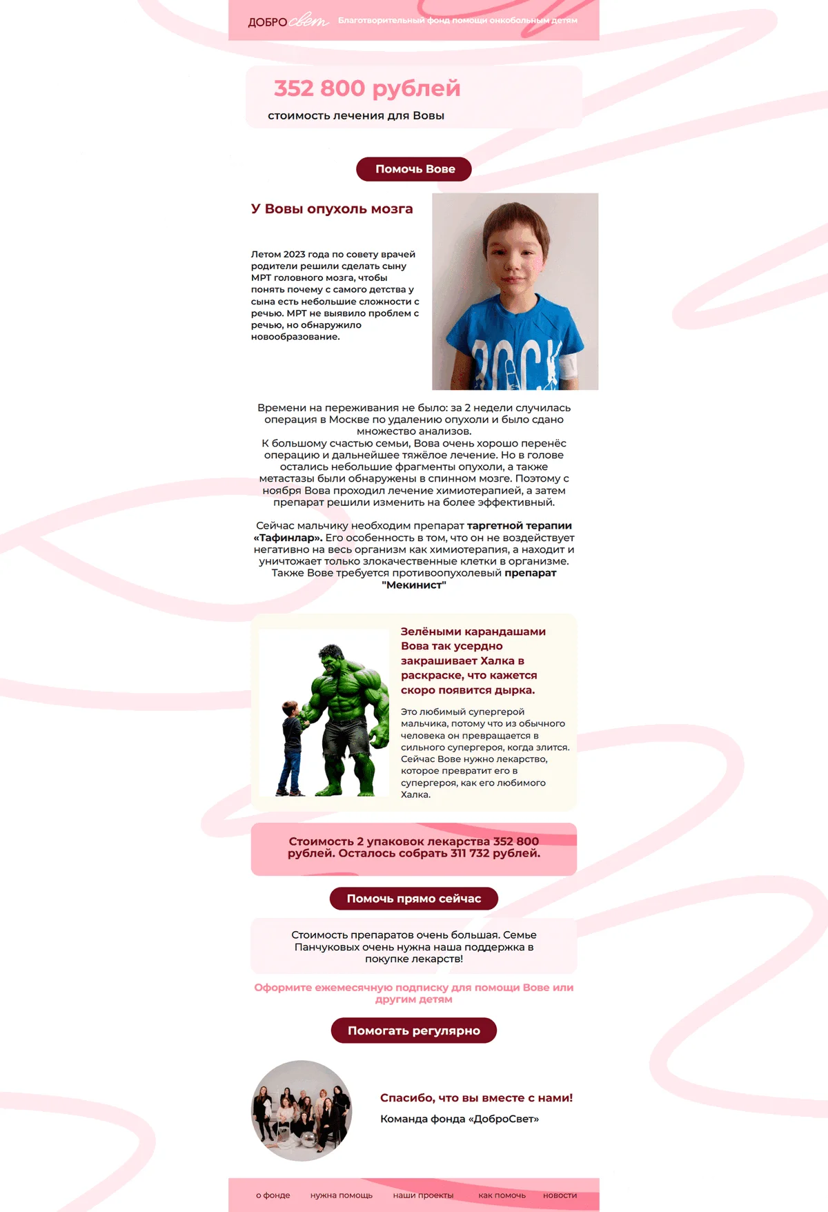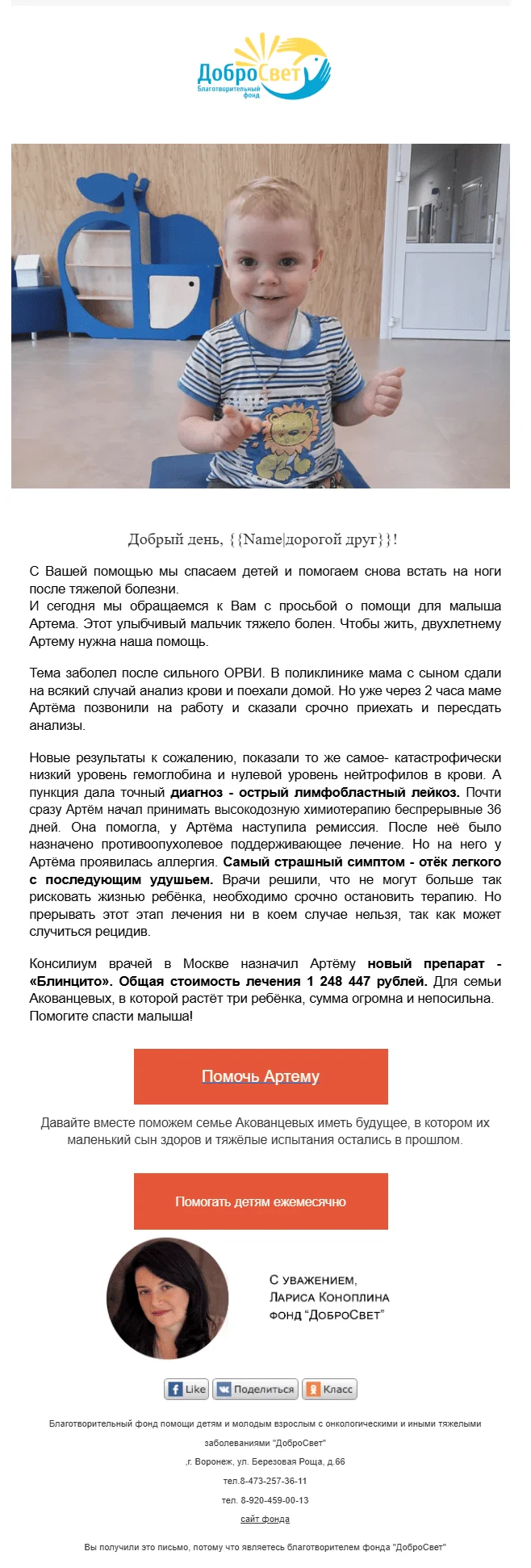 Привет! Меня зовут Лариса Коноплина, я специалист по работе с частными благотворителями в БФ «ДоброСвет». Мы помогаем детям и молодым взрослым до 35 лет с онкологическими и иными тяжёлыми заболеваниями.