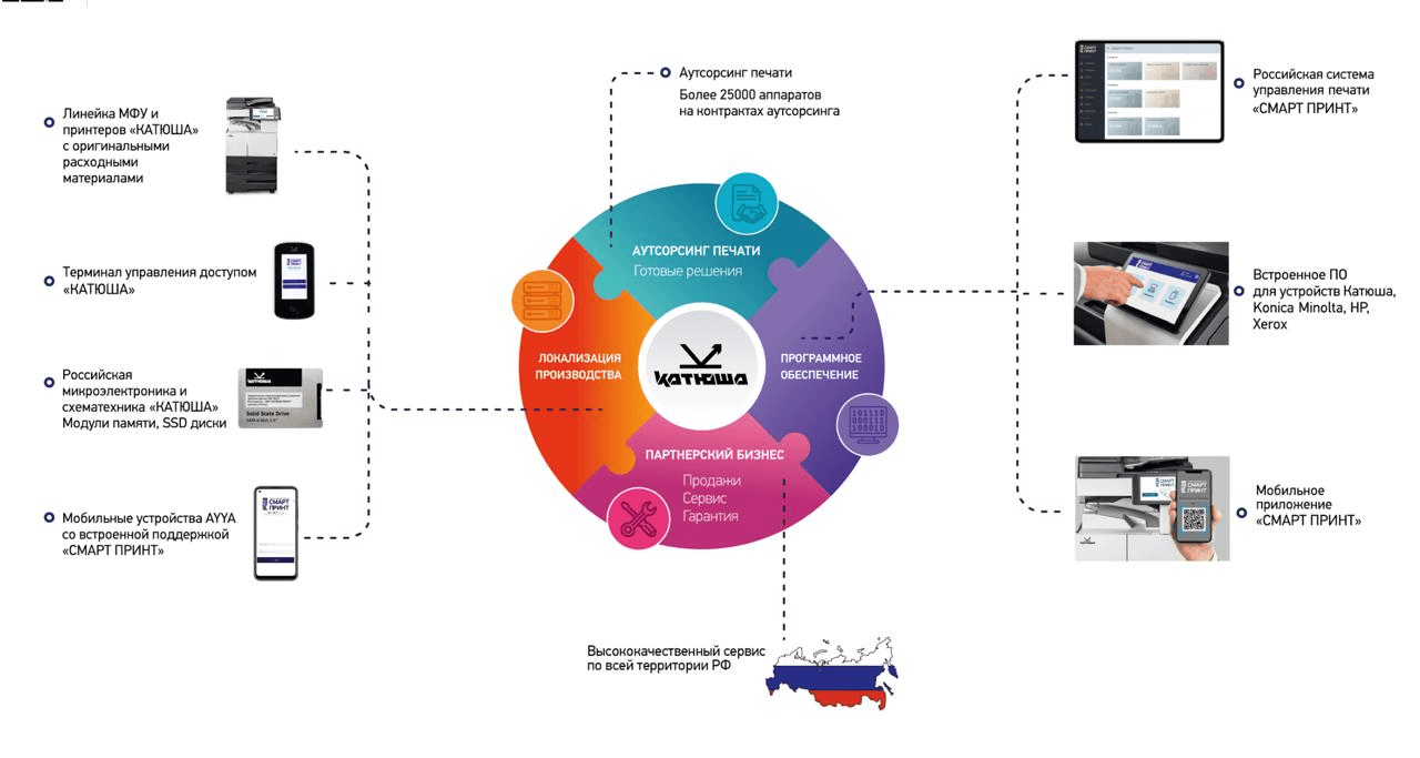 Экосистема включает в себя линейку устройств печати, программное обеспечение, а также сервисные решения и полный аутсорсинг печатной инфраструктуры. Это готовые решения для любой сферы деятельности и организаций государственного и корпоративного сектора любого масштаба.