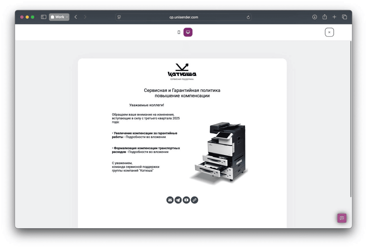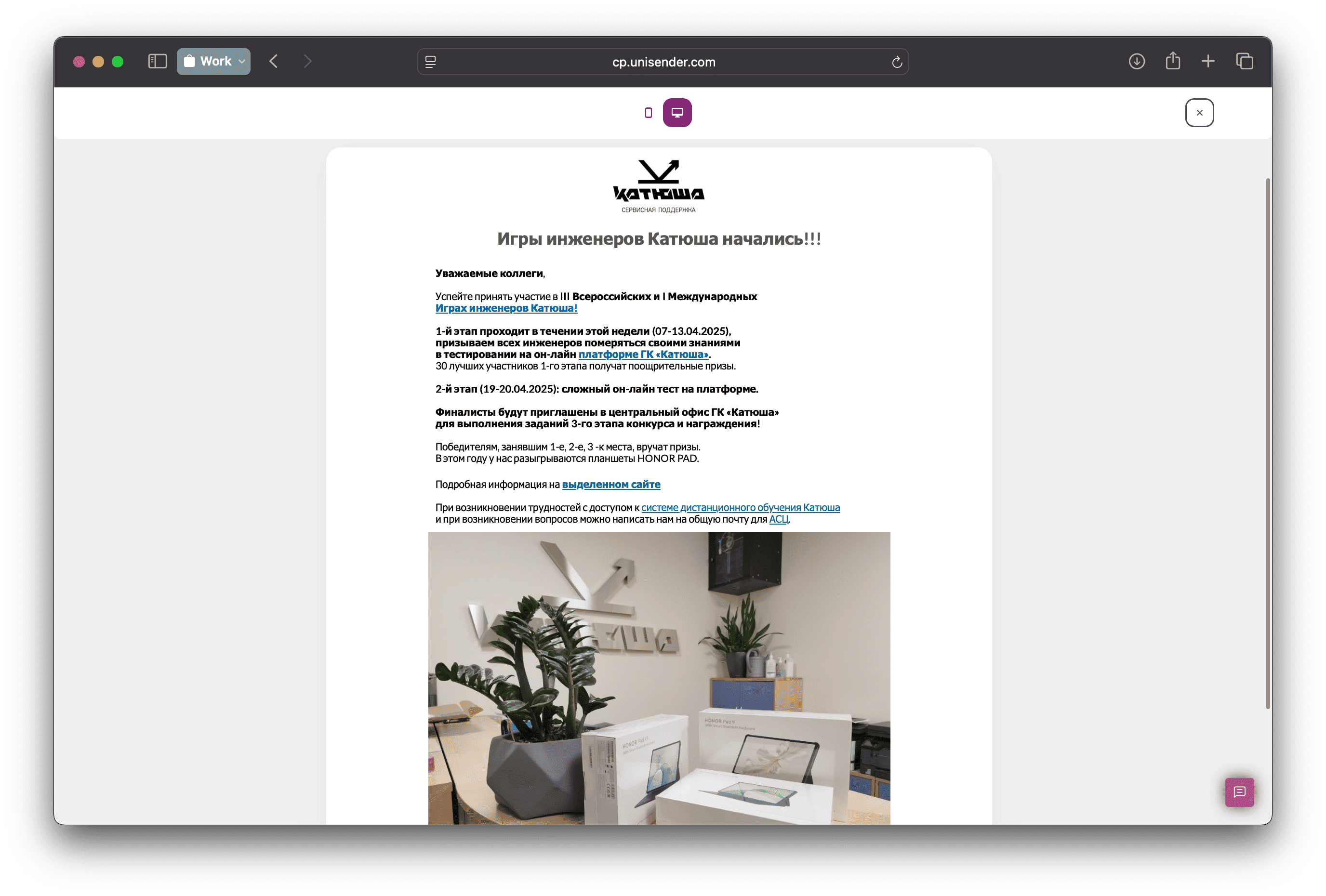 Для ГК «Катюша» рассылки стали эффективным и удобным инструментом. С помощью Unisender у нас получилось легко структурировать коммуникации, сэкономить время коллег, устранить информационный хаос. Теперь это стабильный канал информирования сотрудников и партнеров, особенно в ситуациях, где важно не просто отправить письмо, но и увидеть, что прочли.