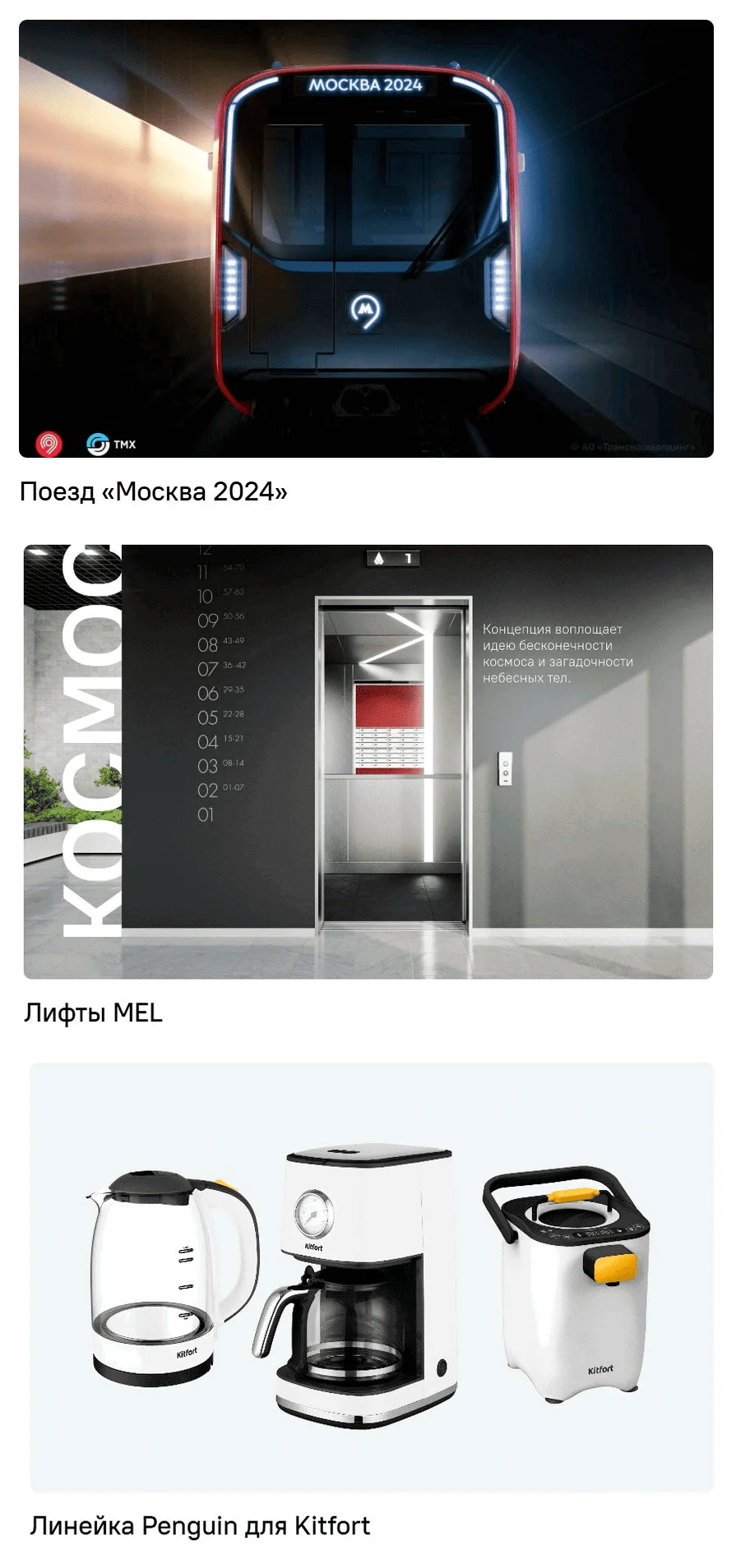 Сотрудничаем с бизнесом различного уровня и государственными институтами. К примеру, создавали дизайн линейки Penguin бытовой техники Kitfort в желтом цвете и поезда метро «Москва 2024».