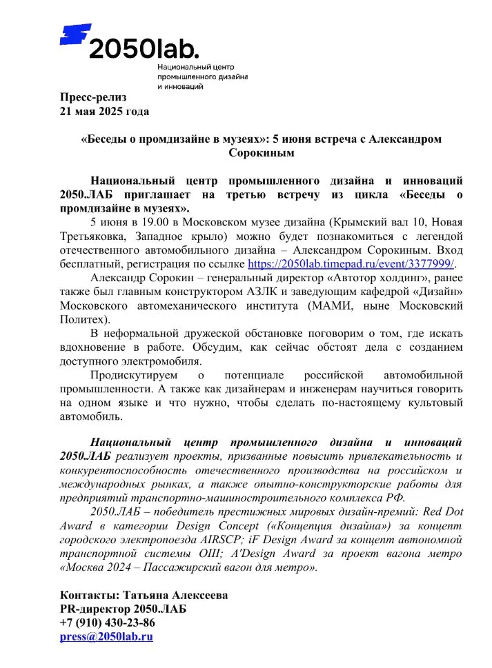 Привет! Меня зовут Татьяна Алексеева, я PR-директор Национального центра промышленного дизайна и инноваций «Лаб 20/50». Мы формируем экосистему индустриального дизайна страны: создаем новые национальные бренды, помогаем бизнесу развивать продукты, формируем интерес к промышленному дизайну как ключевой отрасли креативной экономики.