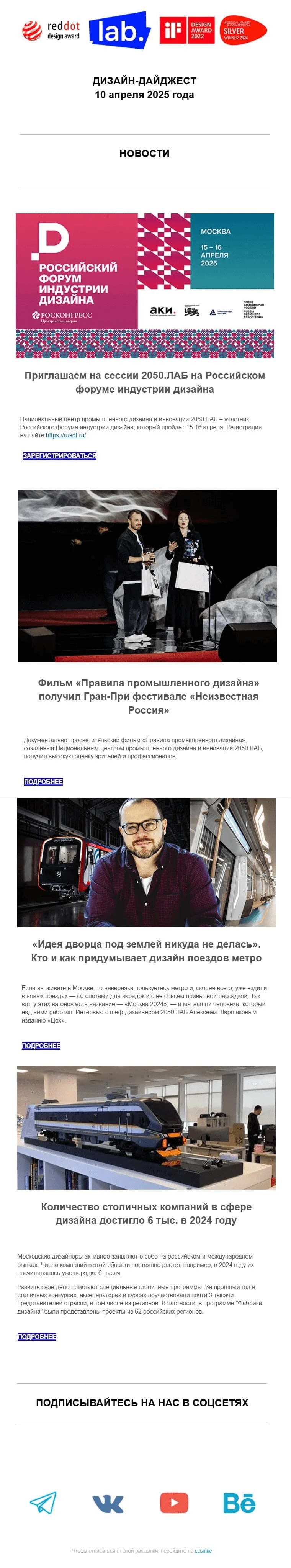 С темой писем не экспериментируем: каждый дайджест называется «ДИЗАЙН-ДАЙДЖЕСТ 2050.ЛАБ». Возможно, это помогает увеличить открываемость рассылок, потому что аудитория привыкла читать дайджесты и сразу выделяет эти письма среди информационного потока на почте.