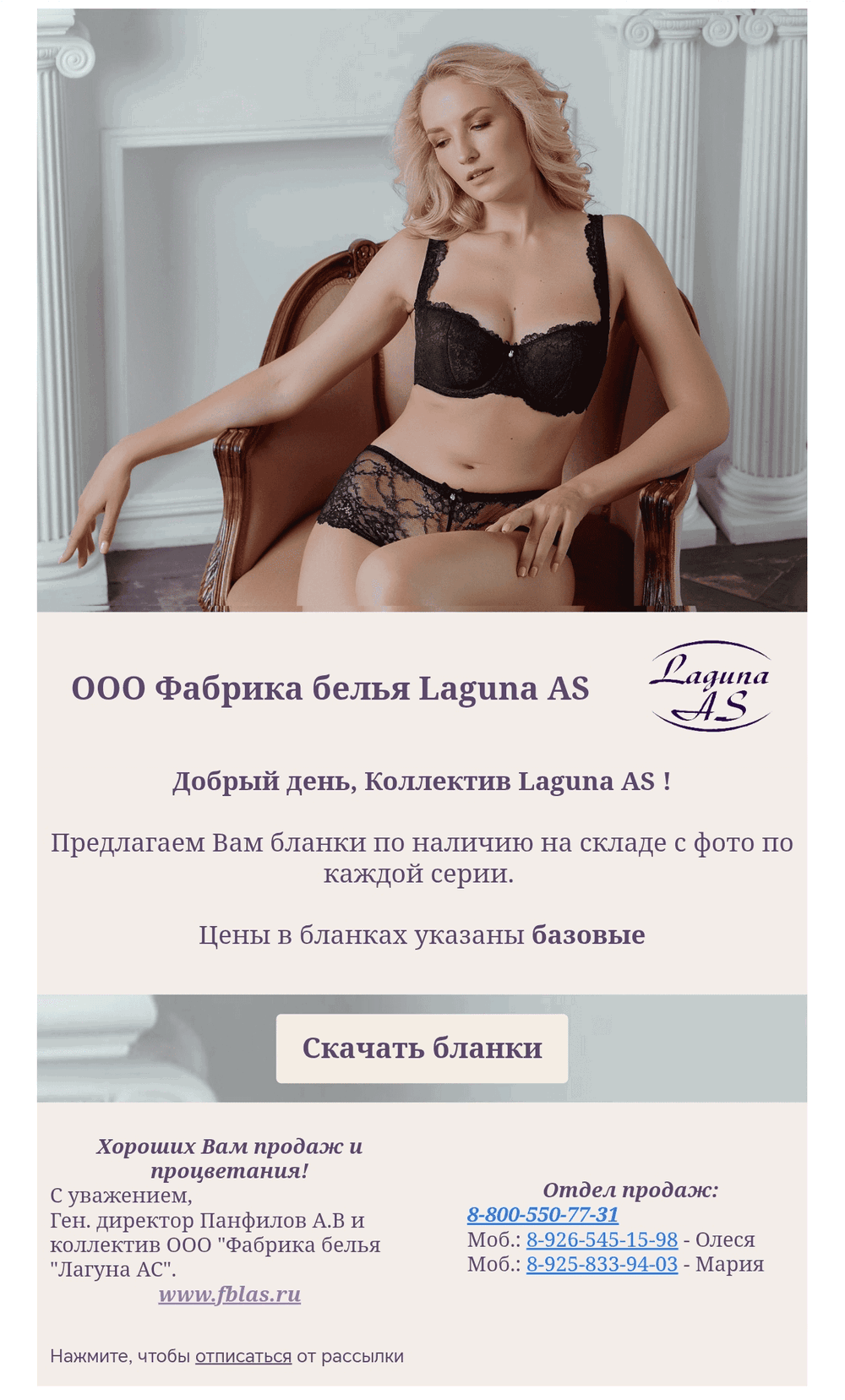 Привет! Я Мария Никитина, маркетолог ООО «Фабрика белья “Лагуна АС”» ― официального дистрибьютора торговой марки Laguna AS в России. Нижнее белье Laguna AS производят в Латвии и поставляют на наш склад в Подмосковье, откуда мы отправляем товар предпринимателям по всей стране. Это семейный бизнес: директор компании ― мой отец, заместитель менеджера по закупкам ― мама. Еще в команде есть бухгалтер, два менеджера и кладовщик.