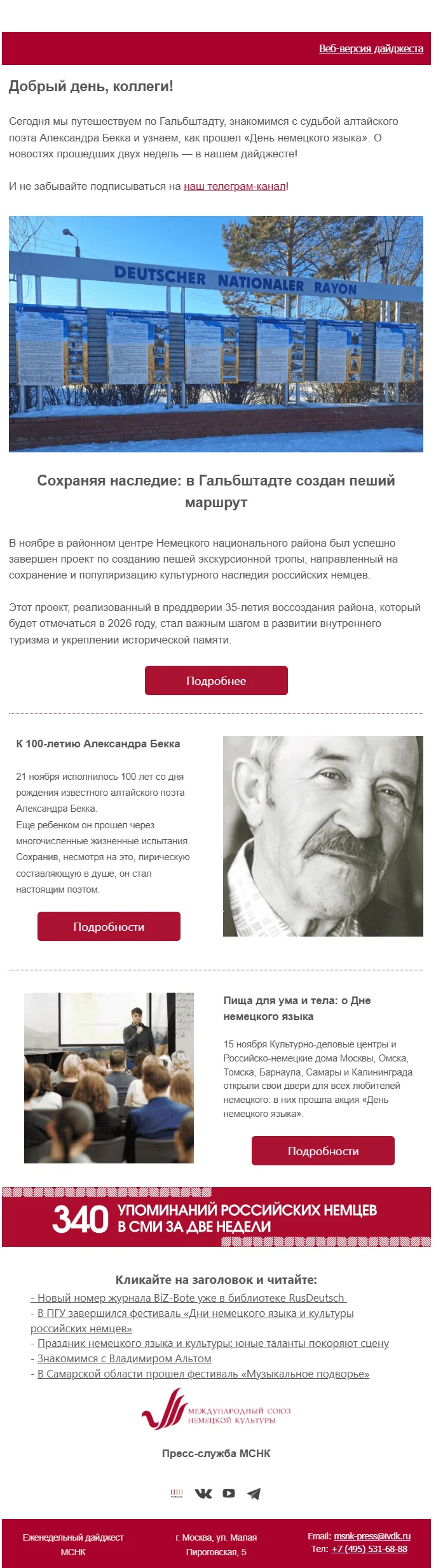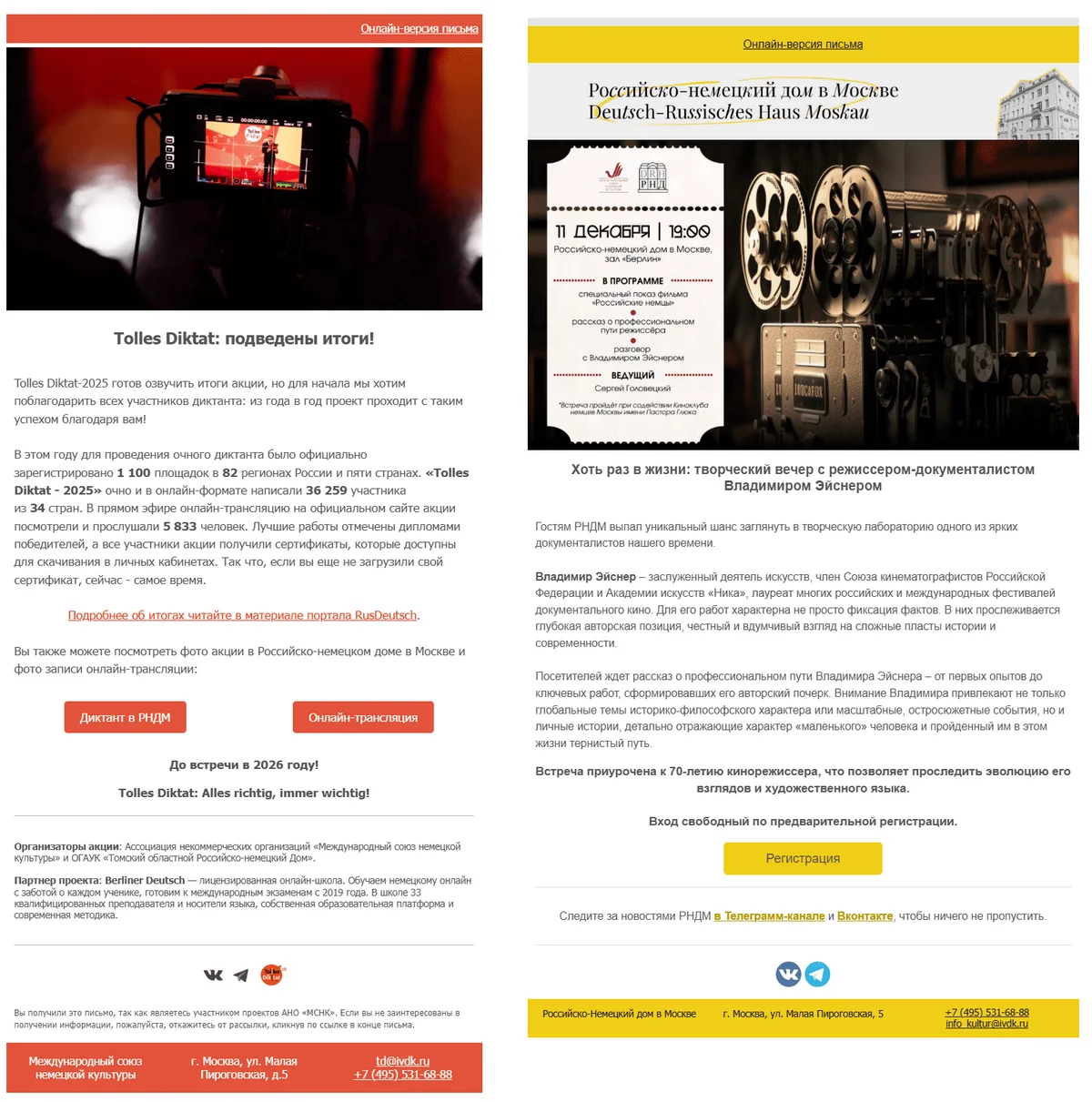 Главная цель рассылок МСНК ― привлечь внимание людей к нашей деятельности и новостям о российских немцах. Донести важную информацию, рассказать о событиях, пригласить на мероприятия ― будь то концерт классической музыки, открытая встреча с экспертами или диктант по немецкому языку. Важно, чтобы люди прочитали письмо и узнали что-то новое. Все форматы рассылок работают на это.