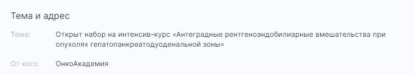 Длинные названия. Первое, что читатель видит на почте ― тема письма. Зачастую от нее зависит, откроет он рассылку или нет, поэтому обычно советуют делать тему короткой и ёмкой. А у нас одно только название мероприятия может выглядеть как «антеградные рентгеноэндобилиарные вмешательства при опухолях гепатопанкреатодуодональной зоны», и еще надо уместить, что это интенсив-курс.