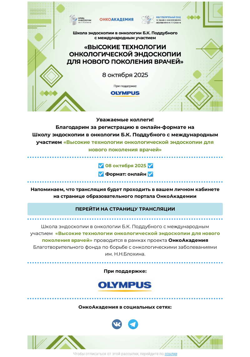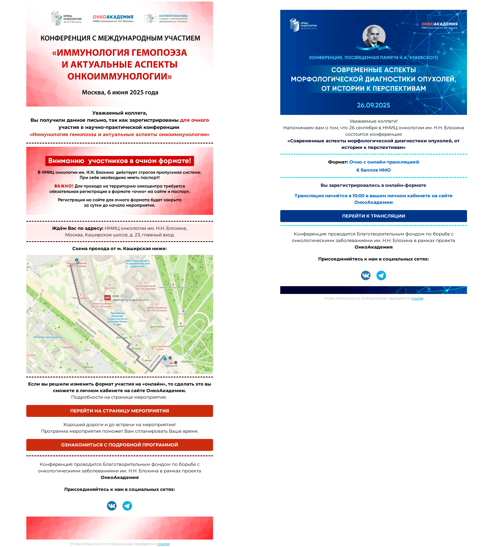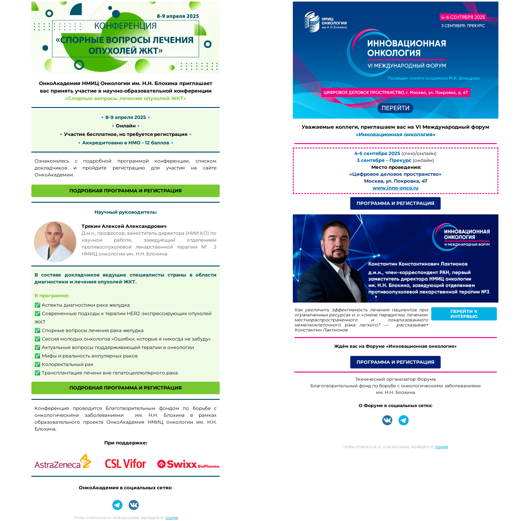Контакты сегментируем по специальностям: например, врачи-онкологи, хирурги-онкологи, химиотерапевты-онкологи, рентгенологи (необязательно с онкологическим уклоном). Но при отправке писем сегментацию используем не всегда, потому что на практике выяснили, что с рассылки по всей базе регистраций обычно больше. Это связано с мультидисциплинарностью медицины. Например, на конференции по онкологическим опухолям пищевода могут присутствовать хирурги, химиотерапевты и патоморфологи, поэтому при отправке по группам можем просто не включить сегмент, который тоже интересуется темой.