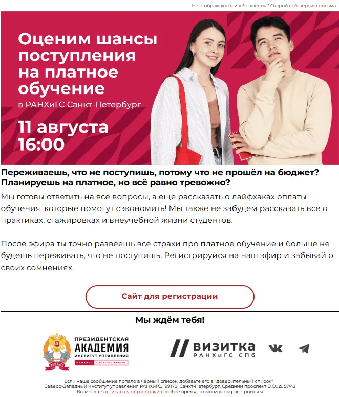 Привет! Меня зовут Артём Челпанов, я менеджер Центра цифрового маркетинга Управления внешних коммуникаций и маркетинга РАНХиГС Санкт-Петербург. Наш вуз ― крупнейший филиал Российской академии народного хозяйства и государственной службы при Президенте Российской Федерации. В 2025 году на 45 программах высшего образования обучаются 16 000 студентов и слушателей.