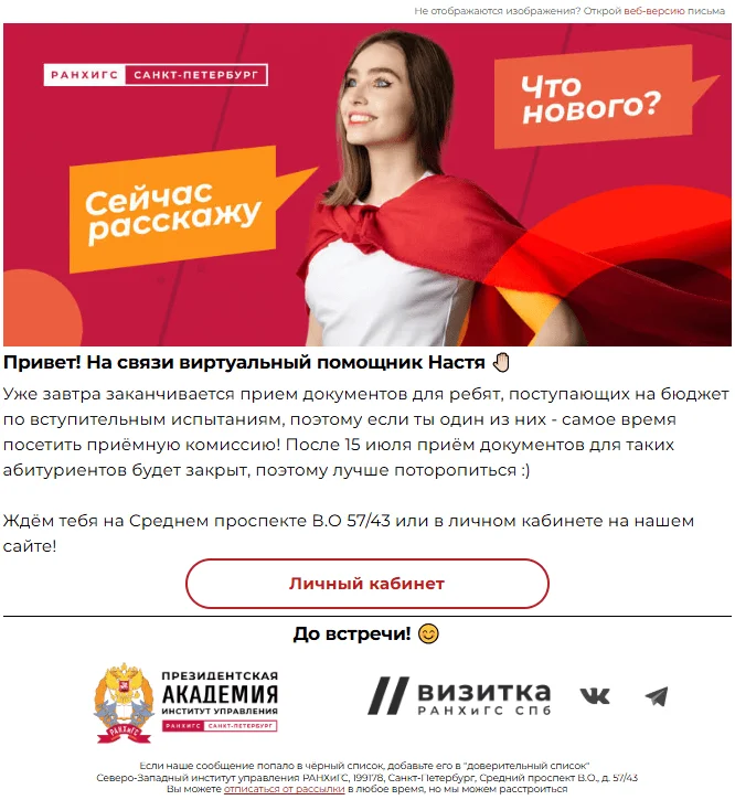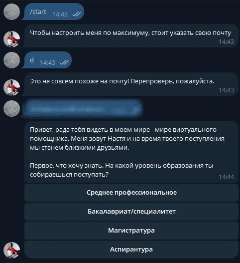 В основном через email-рассылки мы оповещаем абитуриентов, студентов и преподавателей о мероприятиях и важных изменениях. Но в 2023 году дополнительно создали виртуального помощника для поступающих, чтобы разгрузить приемную комиссию и помочь будущим студентам разобраться с дедлайнами и нюансами приема.