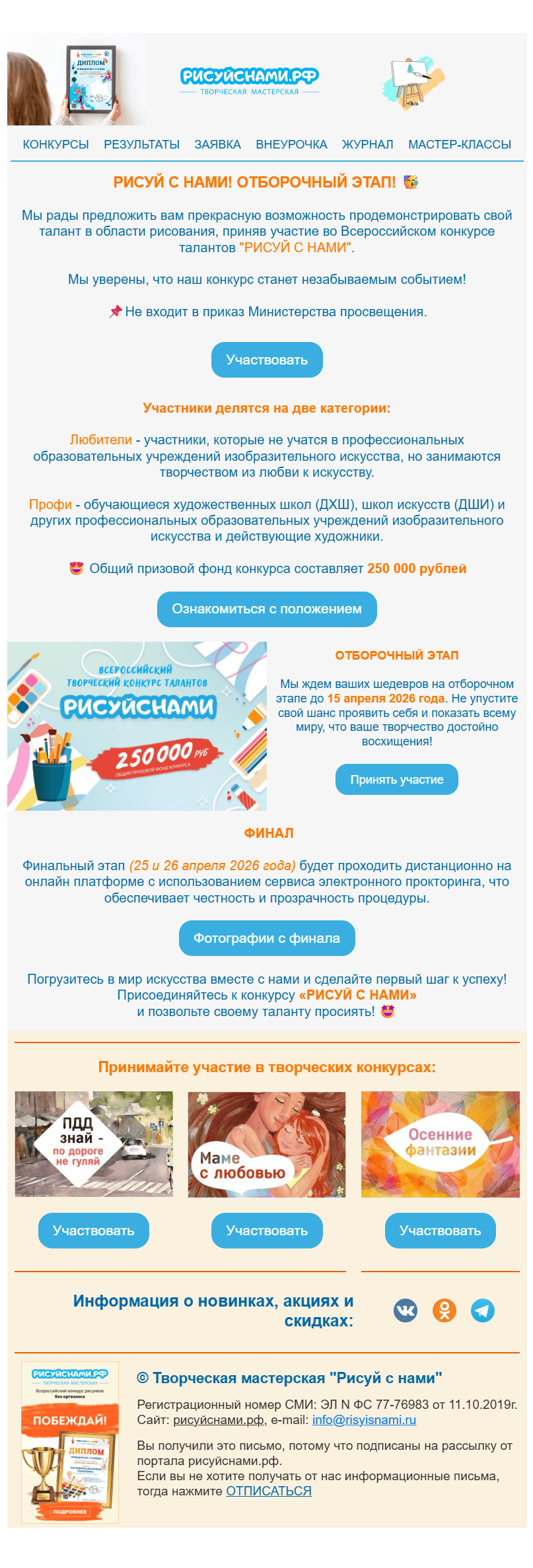 Привет! Я Петр Исупов, сооснователь бренда «Рисуй с нами». Мы постоянно проводим всероссийские творческие конкурсы для детей и взрослых и поэтому отправляем участникам много информации об актуальных мероприятиях и их результатах.