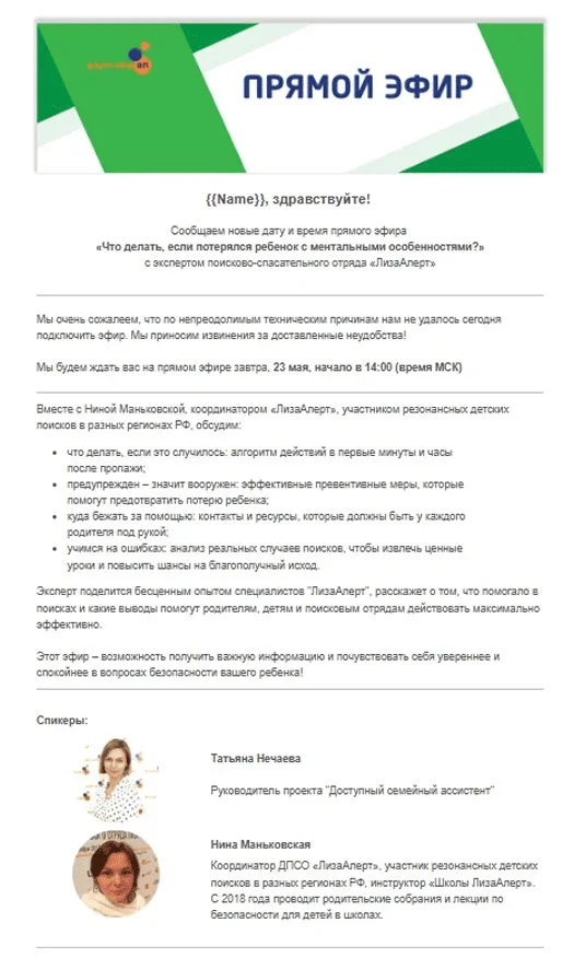 Поначалу это были только письма для партнеров и доноров ― фандрайзинговые, истории подопечных, новости фонда и анонсы. Но со временем через рассылки мы стали направлять и информационно-методическую информацию для благополучателей.