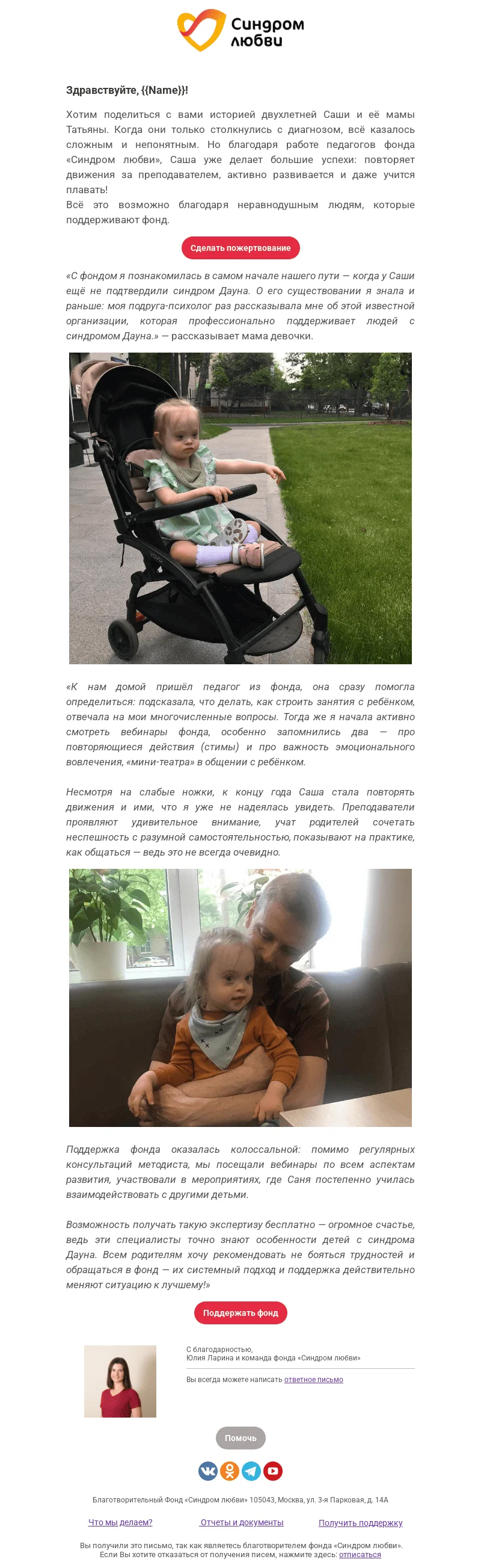 Также есть письма, которые получает конкретный сегмент. Например, каждые три месяца родителям с детьми с дошкольного возраста отправляется информационно-методическая рассылка «ВырастайКа», а родителям с детьми школьного возраста и взрослыми людьми с синдромом Дауна ― рассылка «Я все смогу».
