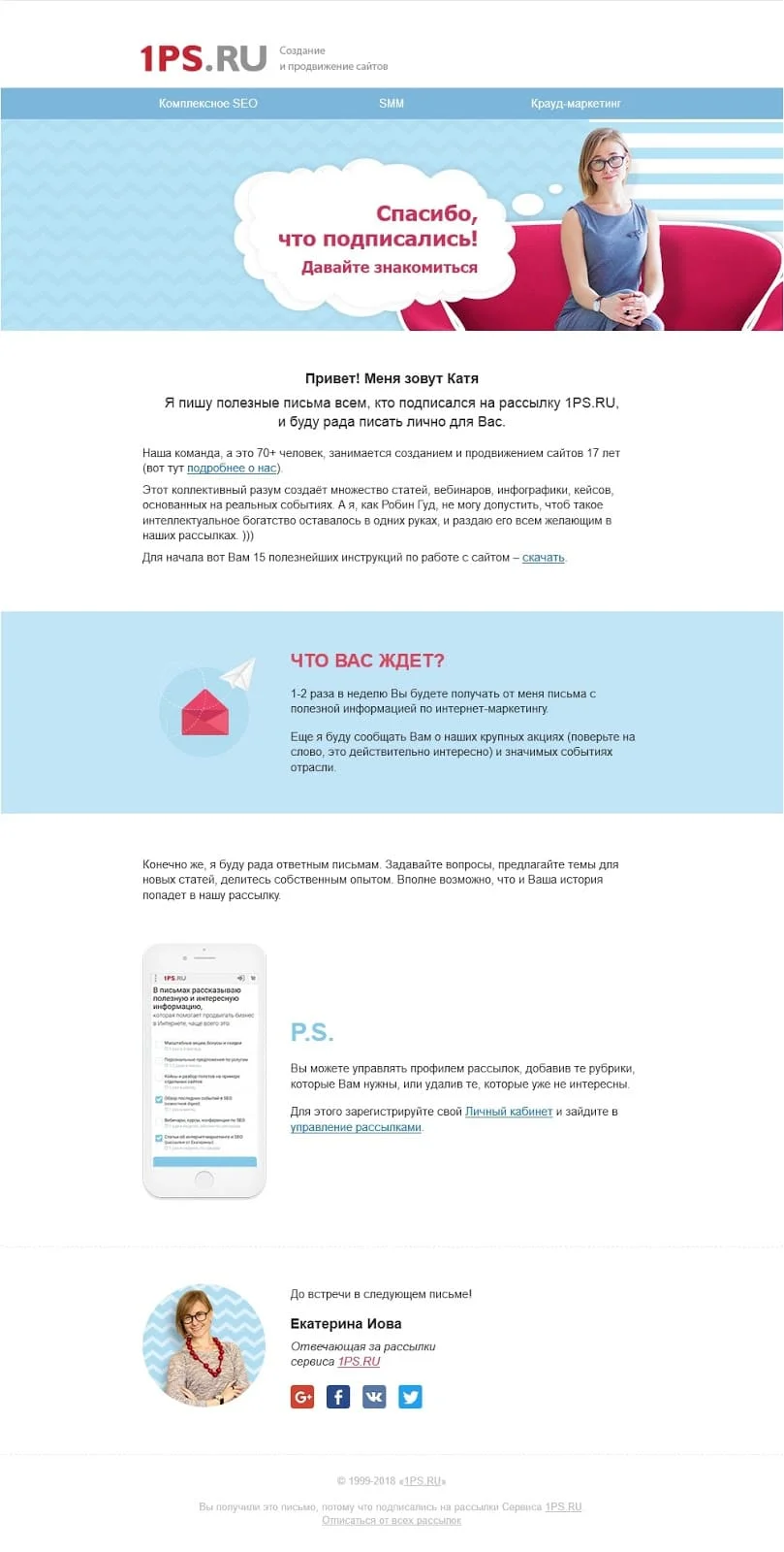 Что это. Компания, которая создает и продвигает сайты. В письмах 1PS рассказывают о раскрутке бизнеса, делятся кейсами и присылают советы экспертов.
