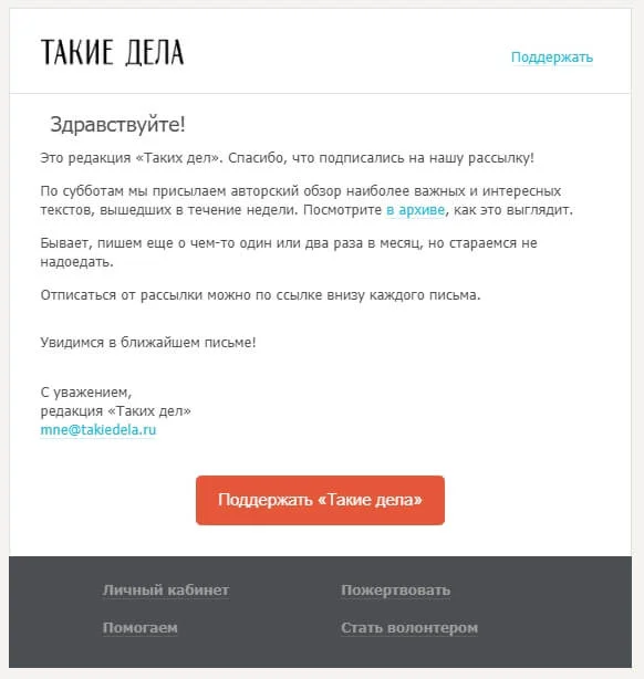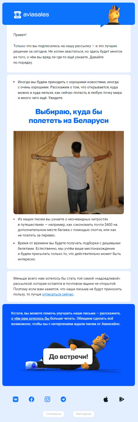 Welcome-письмо — второе письмо, которое получает пользователь (после подтверждения подписки). Подписчики открывают приветственные письма чаще, чем любые другие из массовых рассылок. Не упускайте такой шанс получить больше переходов и рассказать аудитории о себе. Мы старательно отобрали 35 классных примеров приветственных сообщений из разных отраслей бизнеса. В статье расскажем, чем они хороши. Летс гоу!