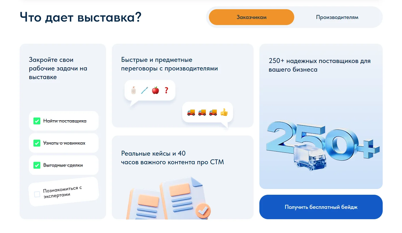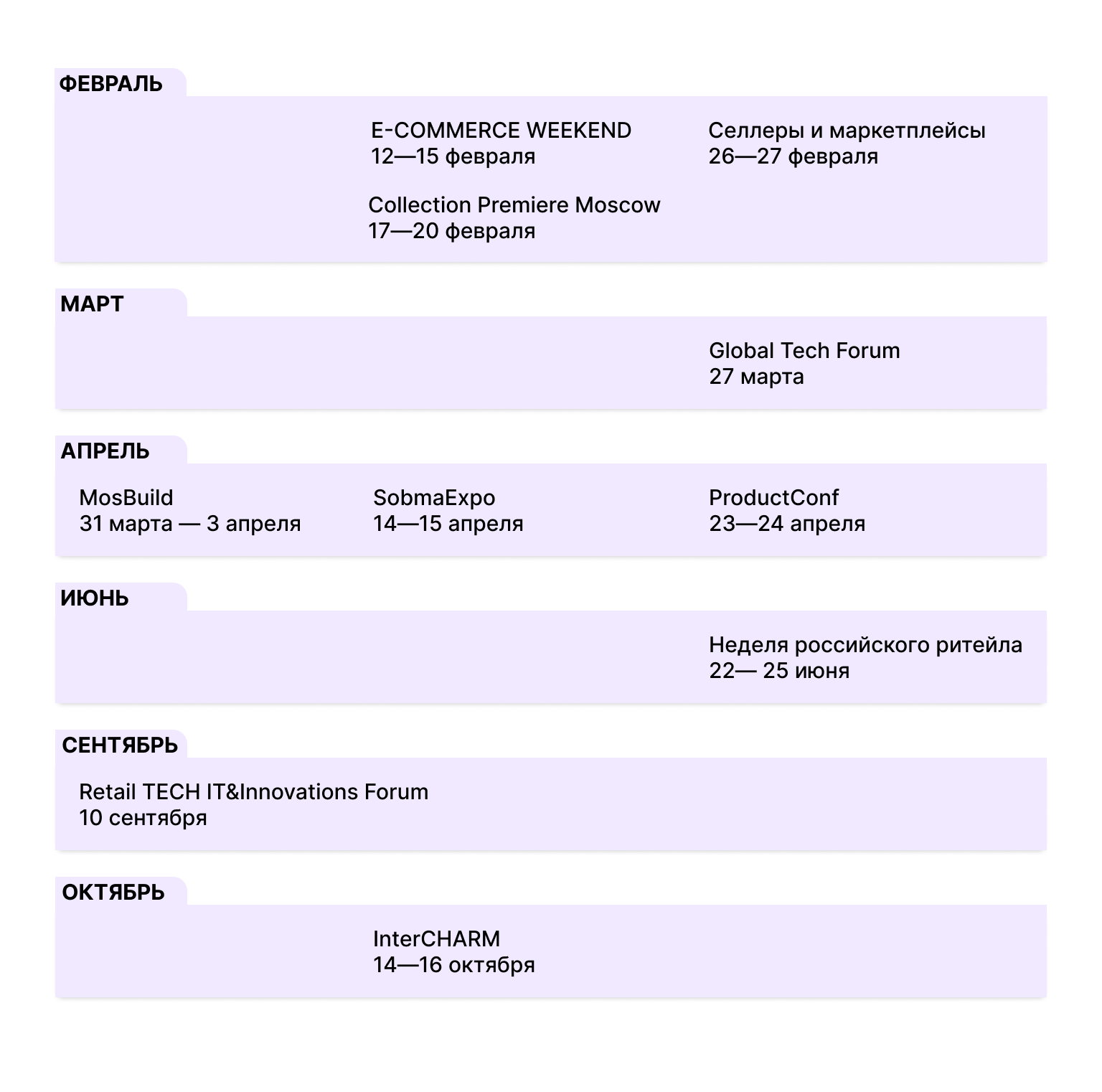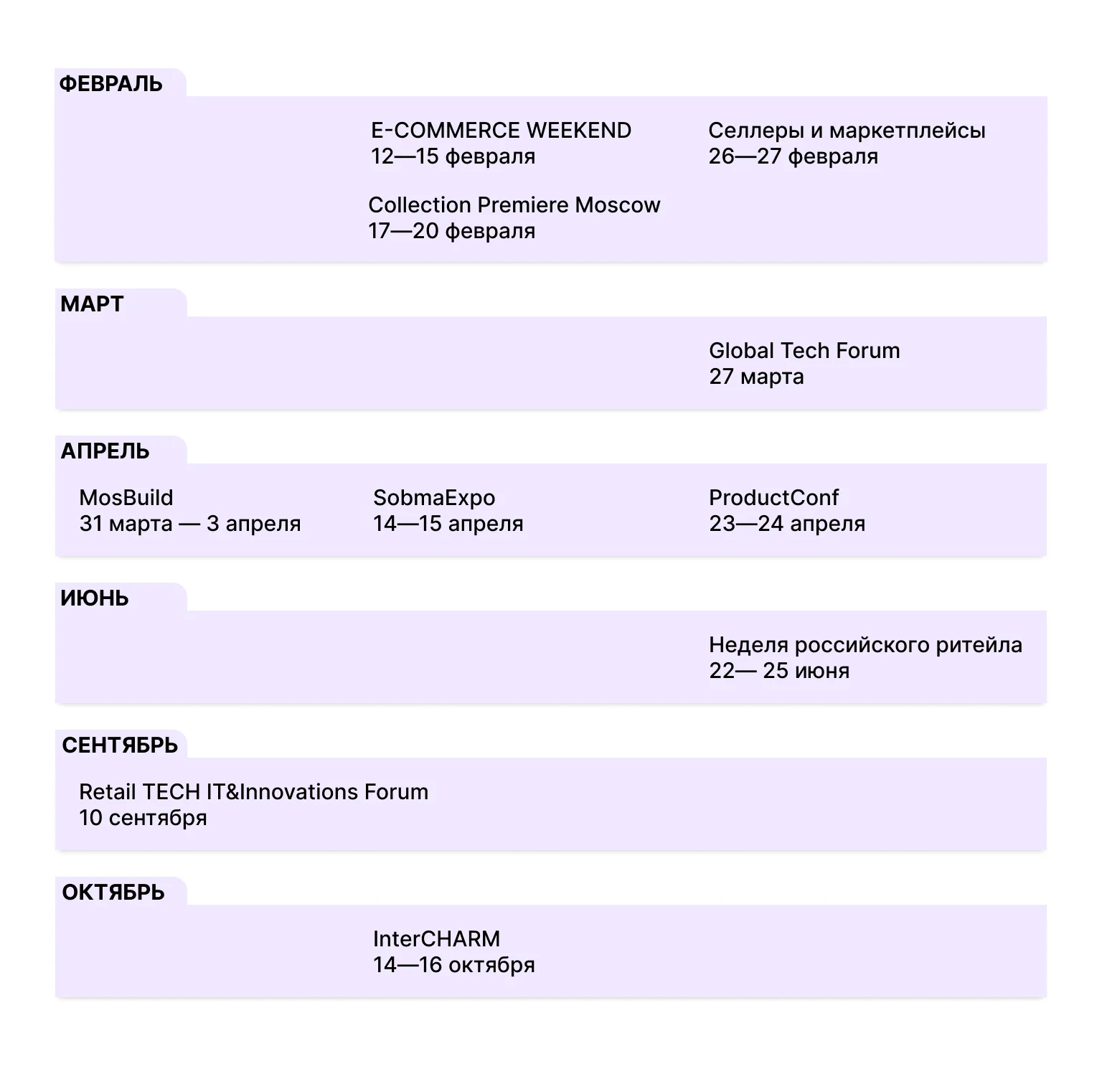 Поделиться опытом, узнать о трендах, подсмотреть лайфхаки для продвижения товаров в сети и найти партнёров — всё это возможно на выставках, форумах и конференциях. Поэтому открывайте календарь и добавляйте события в рабочий график.