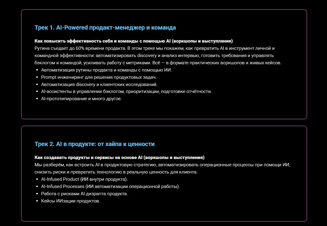Конференция посвящена двум основным трекам: искусственный интеллект для продакт-менеджера и команды и AI в продукте. В спецтреке обсудят, как расти в эпоху нейросетей. Участники смогут наладить профессиональные связи, обменяться опытом и получить новые знания от ведущих экспертов индустрии.