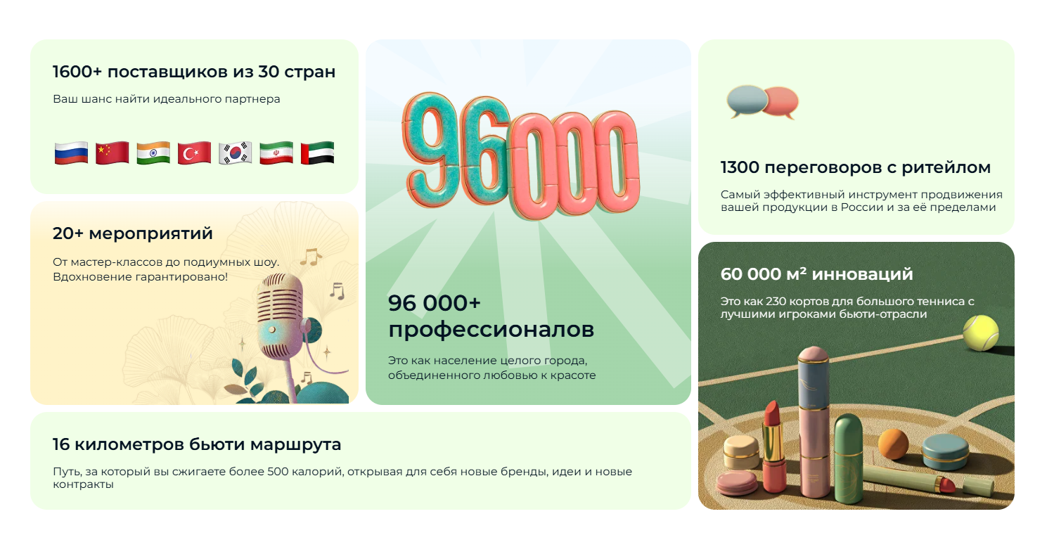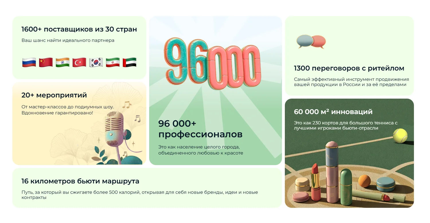 Международная выставка парфюмерно-косметической отрасли объединит представителей бьюти-индустрии и поможет им обменяться опытом и наладить партнёрские связи. На выставке будет много полезной информации о работе с маркетплейсами, трендах индустрии, способах продвижения и клиентском сервисе.